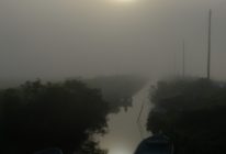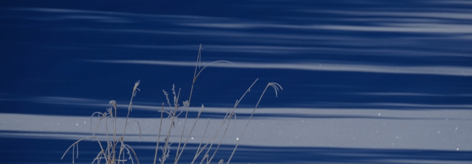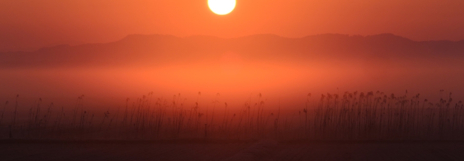 霜が降りた朝の一枚。八郎潟(秋田)へ続く細い水路にのぼる朝日 …